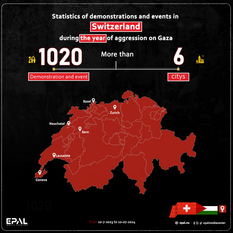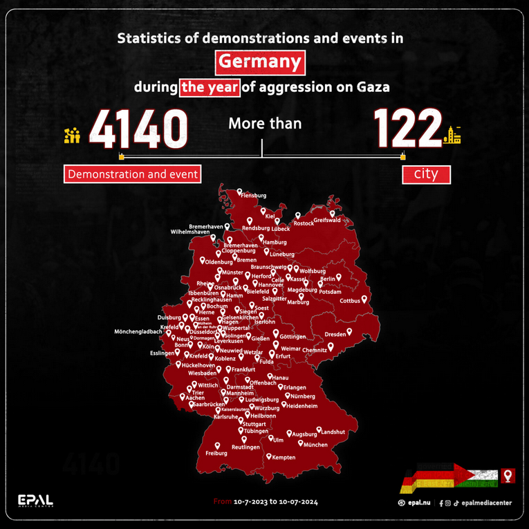 Keskus paljastaa myös, että 18. tammikuuta 2025 mennessä – päivää ennen Gazan tulitaukoa – se oli dokumentoinut 30 000 mielenosoitusta ja tapahtumaa Euroopassa. Palestiinalaisten toiminnan analyysi osoittaa heidän valtavan voimansa ja kykynsä järjestää mielenosoituksia ja toisinaan väkivaltaisia tapahtumia ympäri Eurooppaa, erityisesti Saksassa, Espanjassa ja Italiassa. Raportissa todetaan myös, että palestiinalaiset onnistuvat mobilisoimaan Euroopassa asuvat arabit ja muslimit, jotka samaistuvat asiaan. Esimerkiksi raportin mukaan pelkästään Saksassa järjestettiin 122 kaupungissa yli 4 665 mielenosoitusta ja tapahtumaa – ja tämä oli vain 18. tammikuuta 2025 mennessä.