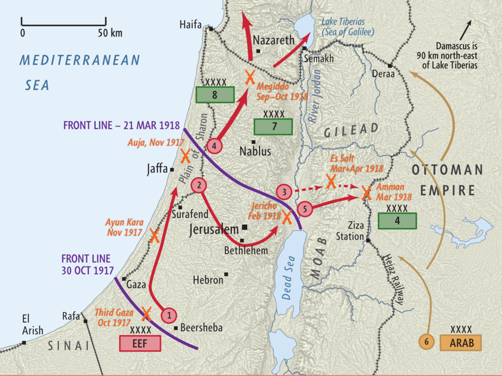 Kun joukko Jordaniaan vuonna 1918 tehtyjä hyökkäyksiä oli lyöty takaisin, EEF meni puolustusasemiin muutaman kuukauden ajaksi, koska länsirintamalla tarvittiin kiireellisesti vahvistusta. Viimeinen voimainkoetus, joka alkoi Megiddon taistelusta syyskuussa 1918, johti kolmen ottomaanien kenttäarmeijan tuhoamiseen, 76 000 sotavangin ottamiseen ja Palestiinan, Jordanian ja Etelä-Syyrian nopeaan valloittamiseen.