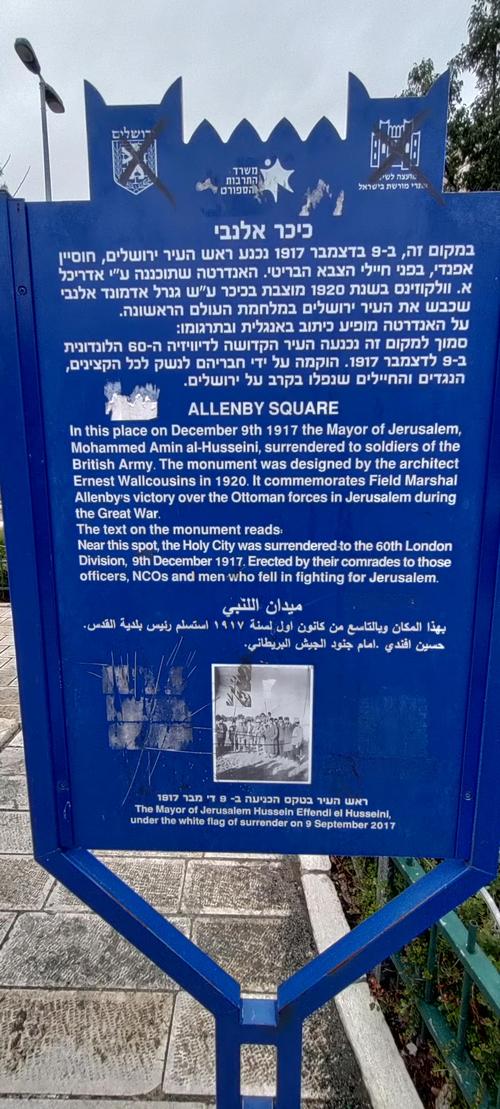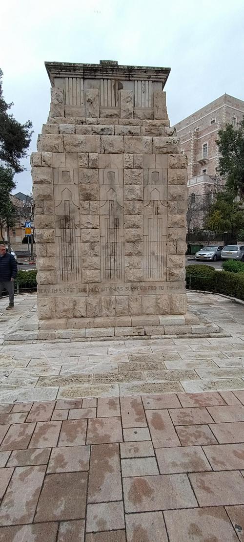 Tällä paikalla 9. joulukuuta 1917 Jerusalemin pormestari Muhammed Amin al-Husseini antautui brittiarmeijan sotilaille. Muistomerkin suunnitteli arkkitehti Ernest Wallcousins vuonna 1920. Se muistuttaa kenttämarsalkka Allenbyn voitosta ottomaanien joukoista Jerusalemissa suursodan aikana,