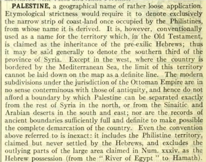 Vuoden 1911 tietosanakirjan PALESTINE-artikkelissa todetaan, että kyseessä ei ole maa vaan epätarkasti määritelty alue.