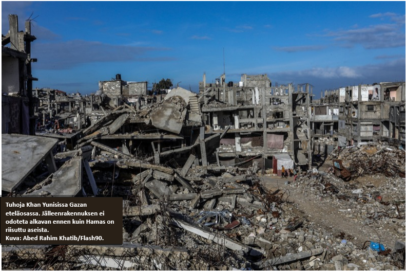 Jälleenrakennus alkaa Rafahissa ja Khan Yunisissa. Israel huolehtii turvallisuussyistä raunioiden ja räjähtämättömien ammusten poistamisesta, jotta niitä ei voida käyttää uudelleen sotilaallisiin tarkoituksiin.
